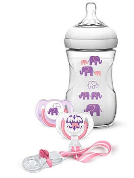 Obsahuje novorozeneckou láhev, novorozenecký dudlík, průhledné víčko, 2 dudlíky s obrázkem slůněte a klip.